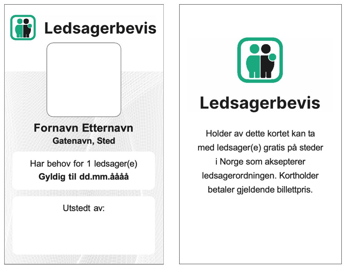 Ledsagere til personer med nedsatt funksjonsevne som ikke kan reise alene, reiser gratis. Ledsagerbevis må kunne fremvises i en billettkontroll. Ledsagerbevis utstedes av kommunen, og det er personen med nedsatt funksjonsevne som får beviset. Her kan du se et eksempel på hvordan et digitalt ledsagerbevis og et fysisk ledsagerbevis ser ut. Ledsagerbeviset vil også angi hvor mange ledsagere det gjelder for.